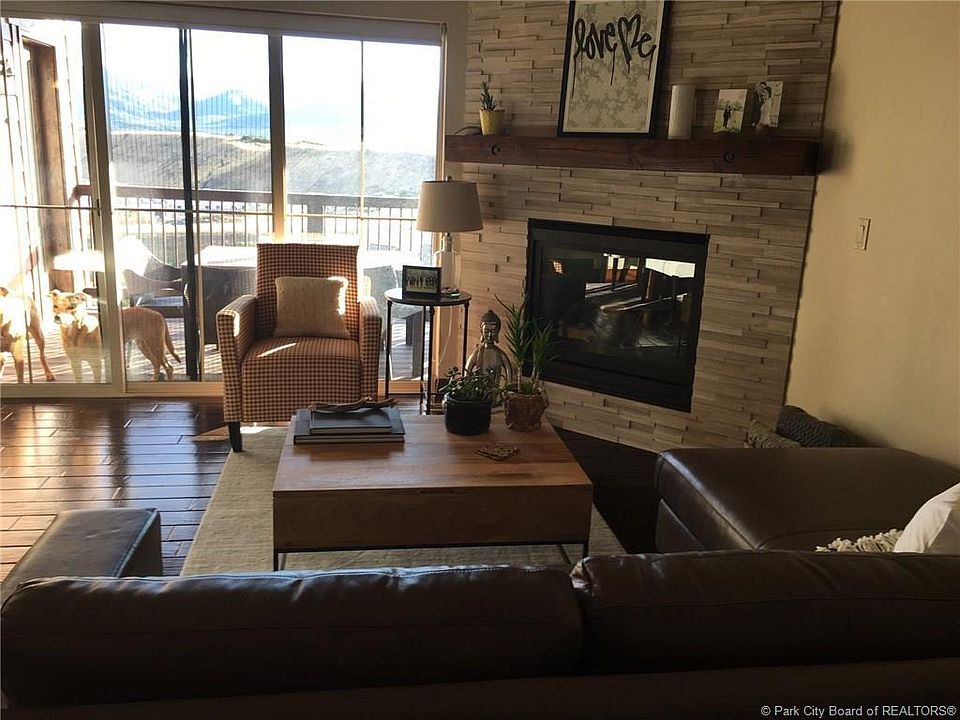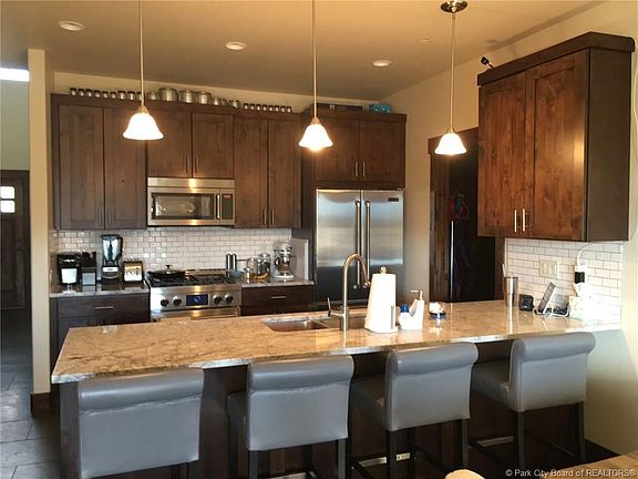 Mountain Contemporary Interior with a COOL NEWER LOOK! Main floor master with large steam shower, walk in closet, extra storage! Great room has a balcony with ski run views and supports a generous informal dining area! Stacked rock gas fireplace, and powder room complete the great room. Kitchen features Jennair appliances, upgraded slab granite counters and subway tile backsplash! Downstairs to the walk out level is a large family/media room with it's own patio out to a grassy yard, two more bedrooms and a full bath. Views from Deer Valley to the Canyons! Don't miss this immaculate townhouse!