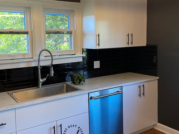 hybrid of all three - Updated kitchen with crisp white cabinetry, black tile, and modern appliances -