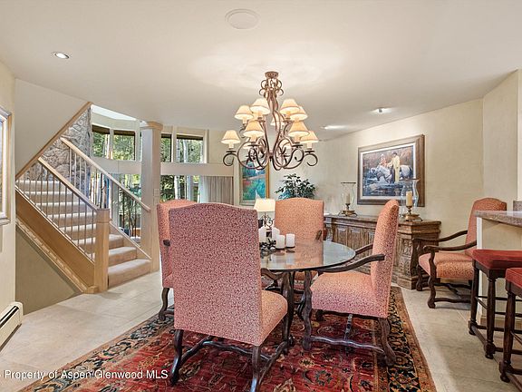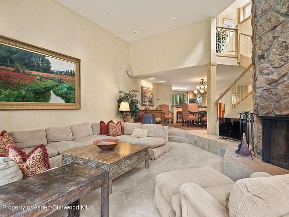 Introducing a rare opportunity to acquire a corner unit at the Aspen Club townhome. This is the first time a home in this sub-division has been available since 2023. This exceptional property features three bedrooms and three bathrooms, each thoughtfully designed to provide privacy. The unit is enhanced by three wood-burning fireplaces located in the primary suite, guest suite, and living room, creating a warm and inviting atmosphere. The expansive living area boasts impressive 16-foot ceilings paired with floor-to-ceiling windows, allowing natural light to flood the space while showcasing the breathtaking surroundings. The sub-division has serene surrounding with a pond, roaring fork river, mature trees, and meticulously manicured landscaping. Enjoy the outdoors from any of the three decks accessible from the living room and kitchen and guest bedroom, perfect for relaxation or entertaining. Convenience is at your doorstep with a leisurely 10-minute walk to town, easily accessible via two scenic bike trails, one of which runs along the Roaring Fork River. This move-in ready gem comes fully furnished, offering a seamless transition into your new home. Don't miss out on this unique opportunity!