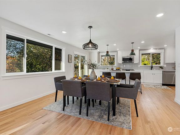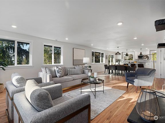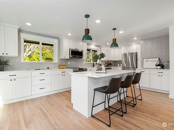 Perched above the street w/views of the Puget Sound & Olympic Mountains! This stunner has been beautifully updated w/new finishes throughout. Brand new kitchen w/crisp white cabinetry, quartz counters & tiled backsplash offering ample space to entertain. Dining adjoins the kitchen & living w/deck-a serene PNW retreat. 3 beds on main plus full BA offer the ideal layout. Master w/WIC & ensuite ¾ BA w/timeless tiled floors & surround, new dual vanity & stylish fixtures. Sprawling lower w/separate entrance has generous 4th bed w/Jack & Jill BA, office/flex space, and bright & airy bonus. New windows, doors/trim, rich refinished hardwoods, furnace, 660sf garage w/new doors & more! Level yard, mature trees, close to DT & great schools.