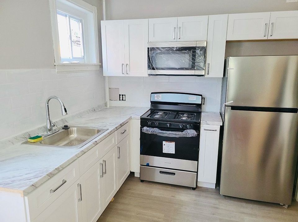Freshly painted 2 level, 2 bedroom, 1 bath apartment with a newly renovated bathroom. Newly renovated eat in kitchen with new stainless steel appliances, new cabinets and recessed lighting. There is new flooring throughout. A front porch for morning coffee and fenced yard for summer relaxation. Off street parking in the rear makes parking hassle-free and convenient. Less than 1 mile walking distance to the Elwood Park Zoo. Within 5 miles to the King of Prussia Mall. Only 17 miles from downtown Philadelphia. This beautiful hideaway is full of old charm with modern finishes. Owner pays electric
