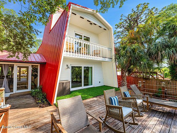 This spacious home boasts a balcony with water views, a private dock with nearby access to the Atlantic Ocean via Sebastian Inlet or Port Canaveral, and a large wooden deck perfect for outdoor entertaining and dining. A screened-in patio and separate private suite offer both comfort and extra privacy.