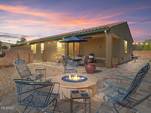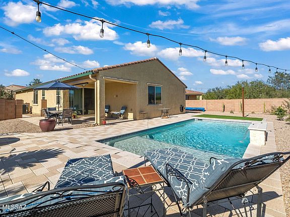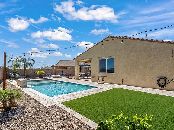 Unobstructed Mountain Views. Immaculate 3 bedroom,2 bath with office + den with NEW flooring throughout. Newly remodeled primary oversized custom shower. Gorgeous kitchen with quartz countertops, all stainless steel appliances, huge center island with room for bar seating, oversized walk in pantry. 9 ft ceilings with Large windows provide natural light in the dining area and great room that is wired for surround sound. Resort-style backyard with an incredible sized lot with lagoon pool and unmatched views, gas fire pit, custom pavers, posts with cable for overhead lights, turf, citrus trees, lush landscaping, and accent lighting. Extra side yards that include sheds and Gas stub BBQ area. Back patio features entertainment package with built in speakers. Award winning Vail School district.