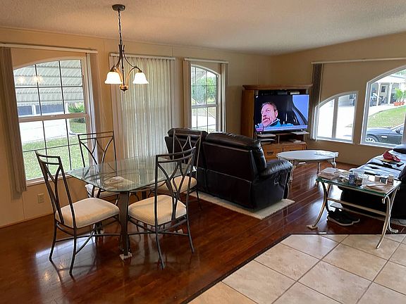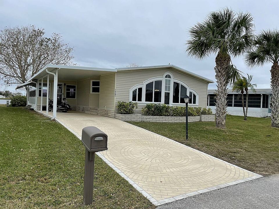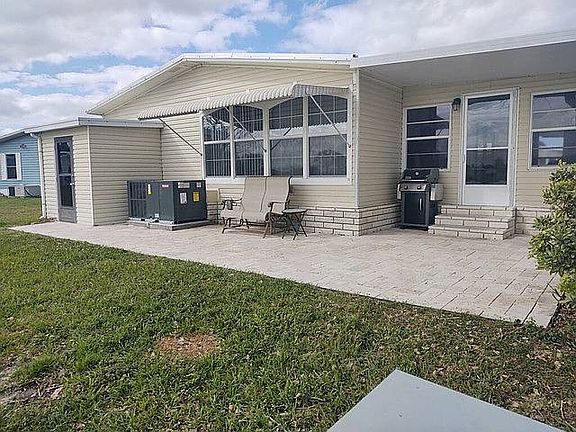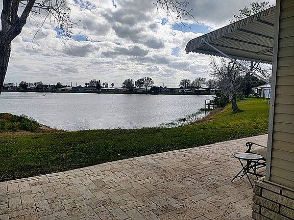 Beautiful 1989 Merrit 28x64 double-wide home with wide open floor plan and cathedral ceilings. This home has all new windows with impact elliptical front windows, a 3-year-old raised metal seam steel roof, and a brand-new 3-ton heat pump for cooling and heating. The home has a full-block foundation and a deluxe etched driveway. The kitchen has new 42" wall cabinets, 36" base cabinets, granite countertops, backsplashes, and window sills for plants. The master bath has upgraded ceramic floors and walls, a garden whirlpool tub, a Koehlor high-seat toilet, and a brand new 40 gal hot water tank. There are hardwood or ceramic floors in all areas (except bedrooms). The large travertine patio in the rear of the home offers a lakefront view of the biggest lake in the community that you can fish from in your backyard.