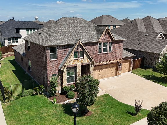 BEAUTIFUL CORNER LOT nestled in the sought-after Frisco ISD, this single-family home offers a perfect blend of modern comfort and classic elegance. A thoughtful five-bedroom layout with dramatic 20-foot ceilings, hardwood floors and abundance of natural light creates an ambiance perfect for both relaxation and entertainment. Additionally, this home offers a guest room, full bath and attached walk in closet on the main level, ideal for visitors or extended family. With a huge backyard, 3 car garages, this home represents a stylish and value-driven option for families seeking peaceful and quality living. The 5 Star rated Glen View community offers top-tier amenities including two scenic ponds, playgrounds, lush green walking trails, and the 13-acre Monarch View Park with pavilion, basketball court, picnic areas, and a zip line. Located minutes from attractions including Omni PGA, Fields Ranch, the future Universal Studios, and upcoming northwest community park this residence offers a combination of tranquil and luxury living. Custom Built area for pets in Living room. A brand-new roof installed in 2024.