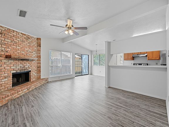Welcome to your new home featuring 2 bedrooms, 2 bathrooms and 2 car garage. This split bedroom floorplan boasts a corner floor to ceiling brick fireplace. Large family room with luxury plank flooring & vaulted ceiling opens to dining room with sliding glass door that leads to private backyard with attached storage room and covered patio. The inviting kitchen offers a large walk in pantry. All bedrooms feature walk in closets and ensuite bath with tiled tub & shower combination. Hurry this will not last long!