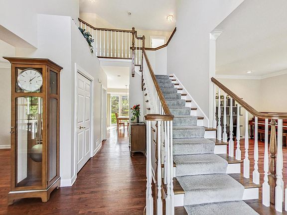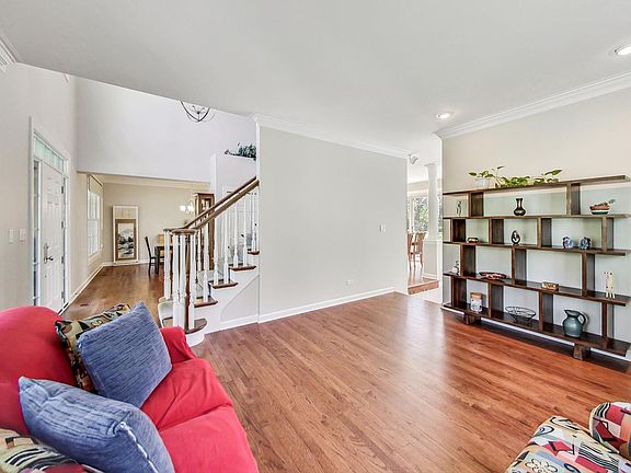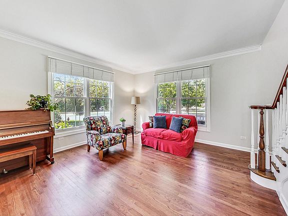A charming front porch, accented with brick and cedar siding, welcomes you to this beautifully updated center-entry colonial with a modern twist. Step inside the two-story foyer and be greeted by an elegant oak staircase flanked by formal living and dining rooms, both featuring crown molding. Gleaming hardwood floors and 9' ceilings carry throughout the main level, adding a sense of spaciousness and warmth. The gourmet island kitchen, fully remodeled in March 2024, is truly the heart of the home. Boasting quartz countertops, stainless steel Bosch appliances, 48" upper cabinetry, and ample storage, this kitchen is a dream for any chef. Undercabinet lighting highlights the stylish tile backsplash, while the sunny eating area, with its Anderson sliding door, opens to a brick patio in the secluded backyard-perfect for al fresco dining. The step-down family room offers brand-new carpeting, a cozy brick fireplace, and a wall of windows that fill the space with natural light. Tucked away on the first-floor is the office, complete with built-in desks and shelving, provides the ideal setup for working from home. Directly across from the garage entrance, the mudroom offers practical conveniences like a folding counter, utility sink, coat closet, and front-loading Samsung washer & dryer, with a service door providing easy access to the backyard. Upstairs, the vaulted ceilings in the spacious master suite create a grand impression. The recently remodeled master bath is a spa-like escape, featuring decorator tile, a double basin eucalyptus vanity, stand-alone tub with spray faucet, and a double shower with frameless glass doors and a rain shower head. Three additional bedrooms, all with overhead lighting and ample closets, share a well-appointed dual-sink hall bath. An extension of the home's living space - the finished basement offers ample space for a playroom, home gym, or media area, along with generous storage. (Please note the basement is excavated under all but the den, which has a crawl space) As an added bonus, you'll enjoy direct access to three Lake County Forest Preserve trails right across the street, making this home a perfect blend of comfort, luxury, and nature. UPDATES: 2024: Kitchen, carpet in family room & basement, interior painted; 2023: 1 furnace; 2020: AC & heat pump; 2019: cedar shake roof replaced, exterior stained, new front door; 2018: oak hardwood flooring installed in den, living & dining rooms; 2017: Fibrex Renewal Anderson windows; 2014: 2 hot water heaters, 1 furnace