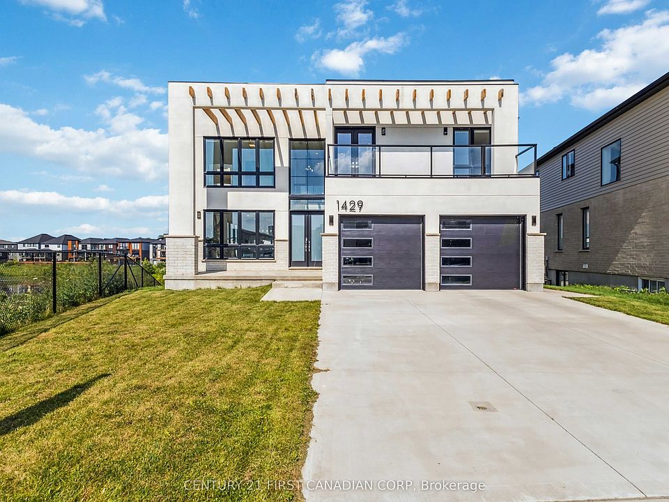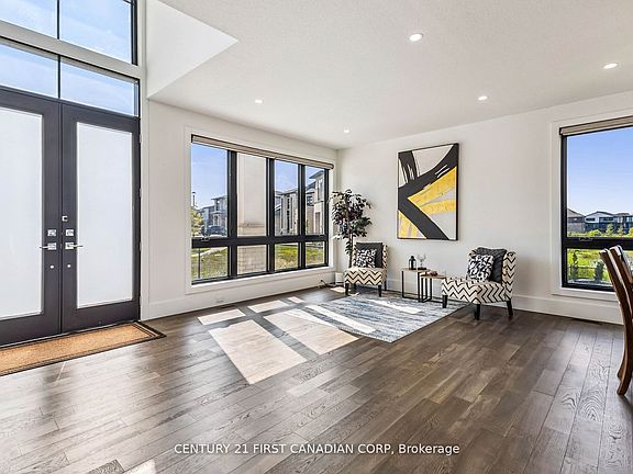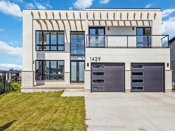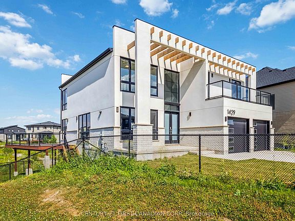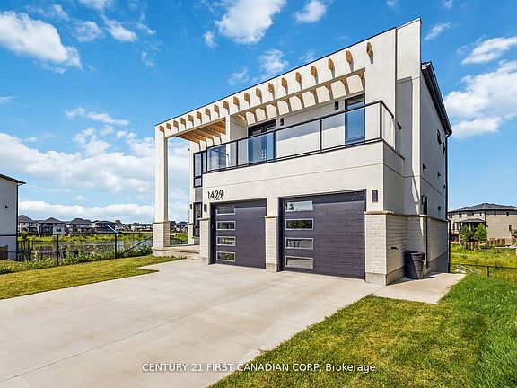 Welcome to 1429 Medway Park Drive a rare opportunity to own a custom-built luxury residence in the highly sought-after Creekview community of Northwest London. Situated on a premium pie-shaped walkout lot, this home offers unobstructed pond and serene ravine views, with no neighbouring house on one side, providing both privacy and scenic beauty. This designer home boasts approximately 3,800 sq ft of exquisite living space, finished with many upgrades that blend elegance and functionality. As you enter the grand 18-foot foyer, you are greeted by refined details like smart blinds throughout, LED stair lighting, and a statement 80-inch Dimplex steam fireplace in the open-concept living room. The heart of the home is the gourmet kitchen, featuring ceiling-height modern cabinetry, granite countertops, under-cabinet lighting, a stylish backsplash, and an oversized pantry all opening onto a spacious living area with rich engineered hardwood floors and floor-to-ceiling windows overlooking the picturesque pond. From here, step out onto the wraparound deck with glass railings a perfect outdoor sanctuary for morning coffee or sunset entertaining. Upstairs, you will find four spacious bedrooms, including a luxurious primary retreat with breathtaking pond views, custom built-ins in the walk-in closet, and a spa-inspired ensuite with in-floor heating, a double vanity, tiled shower, and soaking tub. A junior suite with private ensuite, additional full bath, and a sunny home office/lounge with balcony access complete the upper level.The fully finished walkout basement extends the homes versatility, offering a fifth bedroom, large recreation space, cold bar, full bath, oversized cold room, and private access for potential in-law or income suite flexibility. This home is ideally located close to Western University, University Hospital, shopping, and top-rated schools, making it the perfect blend of luxury, lifestyle, and location.