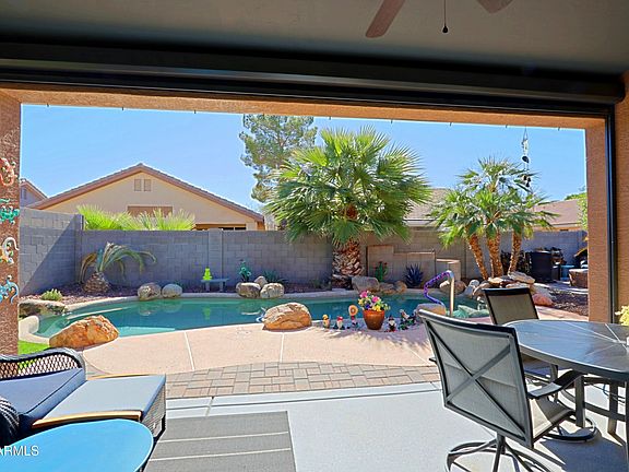 Welcome home to this beautifully updated Fulton property in Calloway at the Vineyards! Enjoy easy access to the 101 freeway, dining, shopping, & historic Downtown Chandler. This 3-bdrm, 2-bath home features a sparkling pool & numerous recent upgrades, including new windows & patio door (2024), remodeled primary shower (2024), new turf & pavers in the backyard (2023), new water softener & misters (2023), & new outdoor shades (2024). Updated interior & exterior fixtures & fans enhance the fresh, modern feel. The spacious great room offers vaulted ceilings & abundant natural light, while the kitchen impresses with granite countertops & newer appliances. Step outside to your private backyard retreat with a covered patio, palm trees, & a refreshing pool—ideal for relaxing or entertaining.