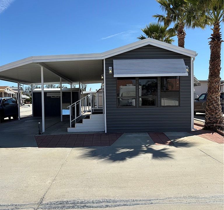 OWN YOUR LAND! DESIRED HERITAGE RANCH 55+ GATED COMMUNITY! Beautiful inside & outside completely remodel from top to bottom shows like new 1981 park model approx 400 sq ft of living area. Kitchen all new appliances & open to the living room with vaulted ceilings and Laminate wood floors throughout. Bedroom has mirrored wardrobe closet doors and extra built in cabinetry. Bathroom updated with shower/tub combo, vanity sink. Mini Split AC/Heating unit & updated electrical . Exterior includes attached covered carport and storage shed washer & dryer included. Incredible views of the San Jacinto mountains. LOW TAXES & HOA FEES OF 218.00 X MONTH includes water, sewer, trash, basic cable & internet and use of the clubhouse, gym/fitness room, library, billiard room, card room, banquet room, indoor spa, outdoor pool, covered patio with circular bar and stools great for hosting social events, shuffleboard facility and many activities to choose from. Close to shopping, restaurants, medical & hospital and great for commuters. Retire in Style!