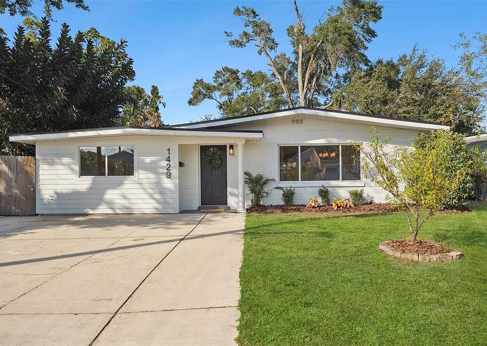 One or more photo(s) has been virtually staged. Completely remodeled 4-bedroom home in the heart of College Park! This mid-century modern gem has been fully updated from top to bottom, featuring a new permitted roof, new HVAC, updated plumbing and electrical, new energy-efficient water heater, stainless steel appliances, soft-close cabinets, a large kitchen island, fresh landscaping, and more. Every detail has been thoughtfully designed for comfort, efficiency, and style. Step inside to discover an open-concept layout with luxury vinyl plank flooring, fresh interior and exterior paint, and designer lighting throughout. The chef’s kitchen boasts quartz countertops, custom soft-close cabinetry, floating wood shelves, stainless steel appliances, and a large island perfect for entertaining. The private owner’s suite offers a spa-inspired bathroom with an extended tiled frameless glass shower and walk-in closet. Two additional bedrooms share a beautifully updated full bath, while the fourth room serves perfectly as an office, studio, play room, or guest suite. Enjoy outdoor living on the rear patio, complete with a cozy firepit, and a fully fenced backyard ideal for relaxing or hosting gatherings. Situated just minutes from Edgewater Drive’s shops and dining, Dubsdread Golf Course, Lake Ivanhoe, and Downtown Orlando, this home perfectly blends modern luxury with classic College Park charm. Located only a few houses down from the light-use rail corridor along N Orange Blossom Trail, the nearby transfer station experiences minimal activity, maintaining the peaceful neighborhood atmosphere that makes College Park so desirable.