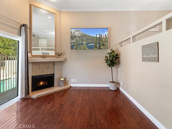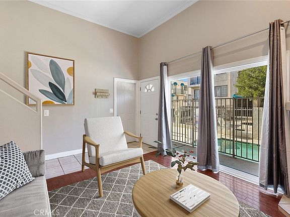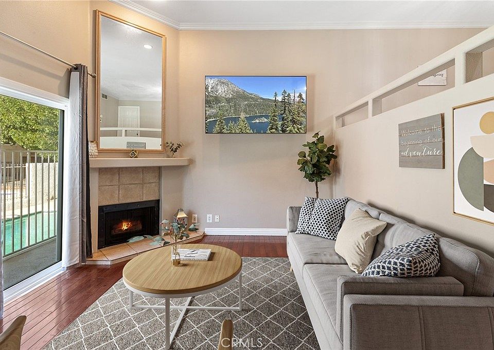 Step inside to a bright and open layout, where soaring high ceilings in the living room create an airy and inviting atmosphere. Sliding glass doors lead to a private patio, ideal for morning coffee or entertaining guests. The home features gleaming hardwood floors, recessed lighting, and vaulted ceilings, adding to its charm and elegance. Upstairs, you'll find two generously sized bedrooms, each offering ample closet space and privacy. Two of the bathrooms have been tastefully remodeled, adding a fresh, contemporary touch.