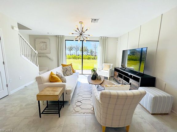 ANNUAL FURNISHED UNIT, Don't miss your chance to live in this former model home, professionally decorated and filled with upgrades. Located in the family-friendly community of Portico, just 11 miles from Downtown Fort Myers, this area has seen rapid growth and development in recent years. The home is ideally situated just a short walk from the community's impressive amenity center. Portico offers resort-style amenities, including a large pool with dedicated lap lanes, a fully equipped fitness center, a separate aerobics room, tennis courts, pickleball, basketball, a playground, a pavilion with grills, a conference room, and more. The home itself is tastefully turnkey furnished with custom paint, designer lighting, and numerous upgrades throughout. The kitchen features granite countertops, white cabinetry, and stainless steel appliances. A full-sized washer and dryer are included. Flooring consists of tile throughout the first floor and carpet in the upstairs bedrooms. The master suite includes dual sinks and a walk-in closet, while a convenient half bath is located downstairs. An open lanai offers a relaxing outdoor space. This home is truly move-in ready offering comfort, style, and convenience in a growing and vibrant area.