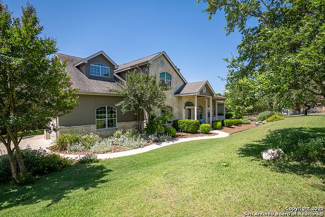 TEXAS HILL COUNTRY CHARM!! Stunning River Crossing home on a private 1.5acres of mature oaks, UPDATED and IMPECCABLE. Stone and stucco exterior with relaxing covered front porch usher you into abundant natural light, soaring ceilings, new chandeliers, new laminate wood flooring and freshly painted for a modern farmhouse style. Texas sized family room embellished with floor to ceiling stone fireplace. Chef's delight granite kitchen updated with white cabinetry, Bosch dishwasher, mosaic tile backsplash, cabinet organizers and new lighting. Generous master suite w/ oversized walk in shower, new vanity sinks, lighting, faucets, his and her toilets, and all new tile floors. HARD TO FIND mother-in-law suite down with walk in shower and new flooring and fixtures. Enormous game room, three secondary bedrooms and full bath up. RELAXATION TIME!! Roomy screened in back porch with dog/kid proof screening. Absolutely gorgeous in-ground sports pool with large tanning ledge and deck, featuring a four foot iron fence with security alarm for safety. Tree house with slide for the kiddos and fenced in dog run. ADDITIONAL FEATURES: Full sprinkler, water softener, high security child locks on all exterior doors, garage workshop area with mud sink. UPDATES: 2020 - Driveway resealed, exterior painted, roof vents resealed, lighting, hardware. 2019 - New upstairs AC, smoke detectors. CALL TODAY!!