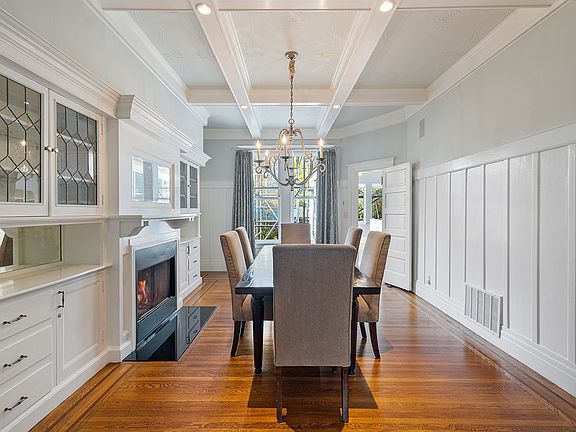 Formal dining room with box-beamed ceiling, built-ins & decorative hearth