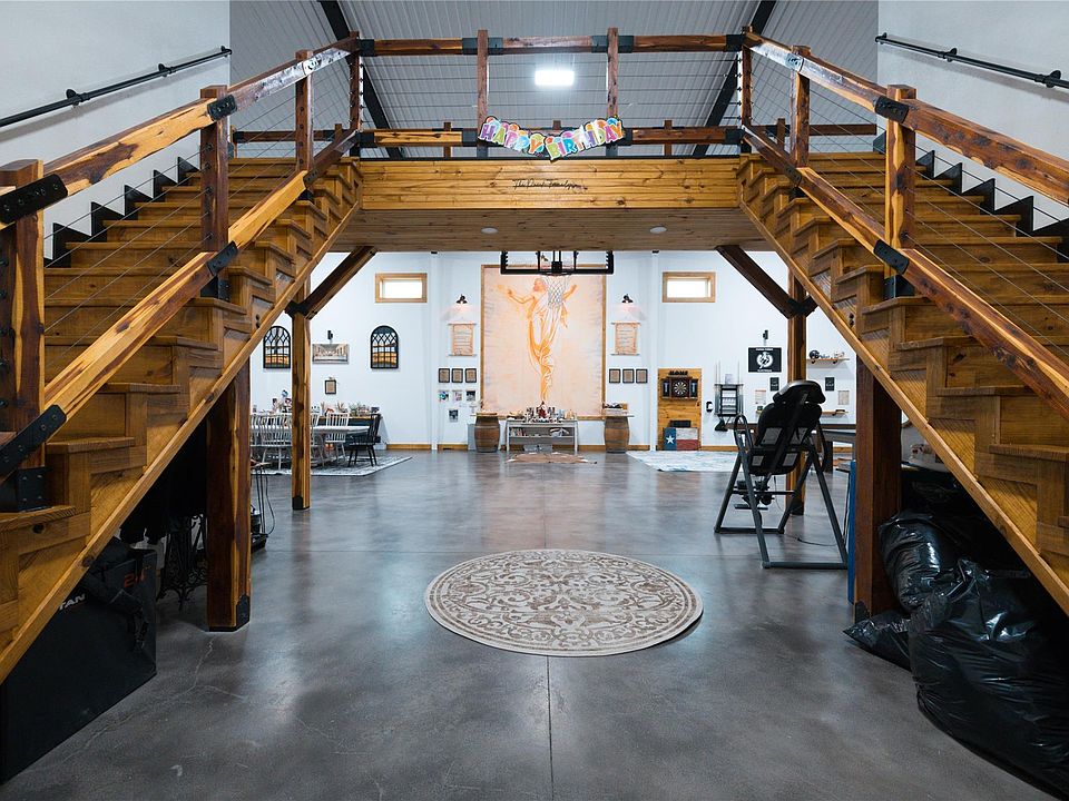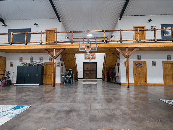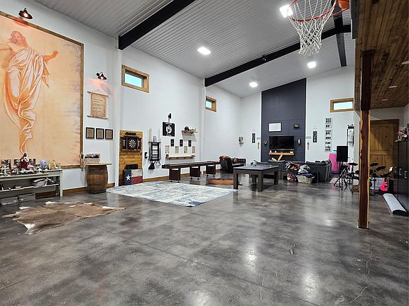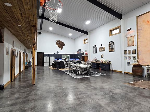 Barndo Mansion Retreat on Unrestricted Acreage This custom 7,200 sq ft Barndo Mansion offers the perfect blend of rustic charm and modern comfort. Step into an impressive open-concept layout featuring 20-foot ceilings, a grand foyer, dual staircases, and a walkway overlooking the main living area. Designed for functionality and entertaining, the floor plan includes 4 bedrooms, 3 full bathrooms, a private office, large butcher pantry with exterior access for convenient grocery drop-off, laundry room, and a spacious kitchen/dining/living/game area ideal for gatherings.  The downstairs owner’s suite is a private retreat with a 4-head walk-in shower, standalone soaking tub with TV, double vanity, and a generous walk-in closet. The home features a warm country-rustic aesthetic, including wood interior doors, custom trim, barn-style sliding doors, and detailed wood accents throughout.  Upstairs, you’ll find 3 additional bedrooms, a full bath, mechanical/storage room, and a charming corner library nook overlooking the open living space below. The concrete back porch is already equipped with electric and plumbing, ready for your outdoor kitchen or entertainment design.  An addition: 500 sq ft enclosed gym/office provides flexible use options such as fitness, studio, homeschool, or business space attached to the shop/garage. The 2,000 sq ft 40x50x18 shop/garage includes a fully equipped finished guest apartment (~500 sq ft) with full kitchen, butcher block counters, full bathroom, washer/dryer hookups, and open living/sleeping layout-ideal for guests, multi-generational living, or rental income.  Situated on unrestricted property with fenced backyard and peaceful country views. No HOA. There is minimal construction remaining; giving you the opportunity to customize final details to match your personal style and vision, to truly make it your own. This one-of-a-kind Barndo Mansion is move-in ready, completely livable, and ready to entertain and accommodate guests.