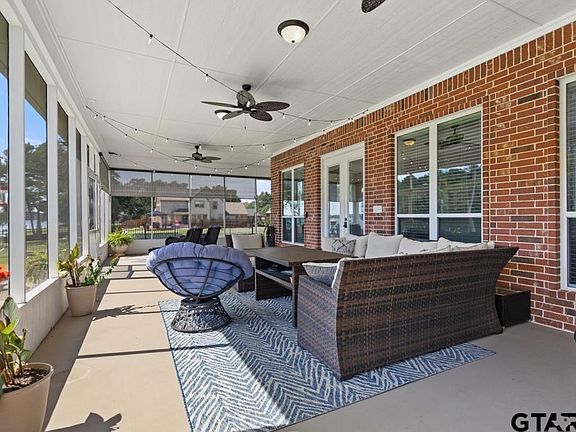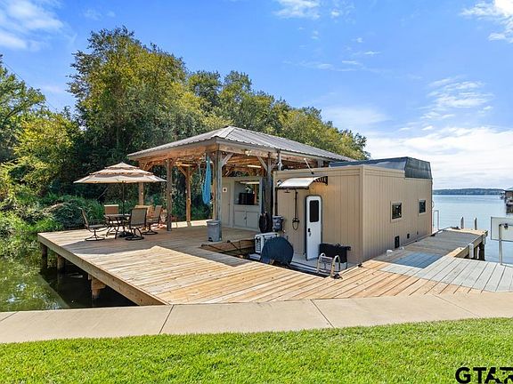 Discover the ultimate waterfront lifestyle in this light-filled, single-level 2410 sq ft. custom home nestled in a quiet community of brick homes on the Southeast side of Lake Palestine. This beautiful home has 3 bedrooms, 2.5 baths, and an oversized 3 Car Garage with room for vehicles, lake toys, and storage. The home is set on 0.85 acres above the 355-foot elevation—with an additional 0.5 acres of Upper Neches River Authority allocation down to the water. You will enjoy over an acre of lakefront playground. This is listing agent’s personal home. Step through double wood doors into an inviting interior highlighted by gorgeous crown molding, eight-foot solid core doors, and ceramic tile floors throughout. The open living and dining area flows seamlessly to a chef’s kitchen with a breakfast bar, all oriented to capture sweeping lake views. The showstopper is the 1,100 sq ft screened porch. It is an outdoor living room where you can entertain, dine, or simply savor sunsets in any season. Above the garage, a decked storage loft and spray-foam insulation add energy efficiency. Enjoy peace of mind at the lake with the remote security gate and 20K Onan whole home generator with auto transfer switch. The buried 250-gallon propane tank ensures your lake life is uninterrupted. Save on storage fees with your very own RV pad with 50 amp power service and utilities. Down by the water, a premium 900 sq ft. boat dock offers a convertible electric dual wave runner lift, locked storage, fish-cleaning station, fans, bug mister system, motion sensors, and security lighting. Enjoy deep, protected water (around six feet at the typical 345-foot elevation), perfect for fishing boating, wave runners, paddleboarding, and kayaking. The sheltered cove ensures calm waters and peaceful mornings. This meticulously maintained custom retreat is ready for you to relax, unwind and enjoy!