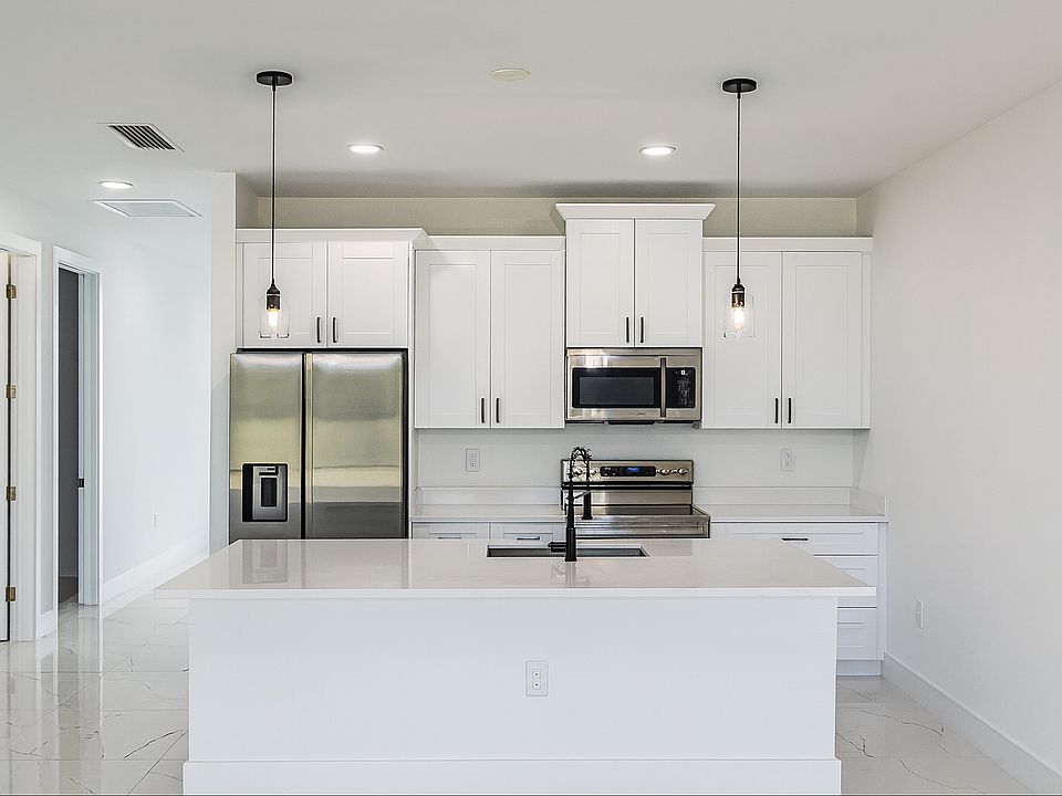 The kitchen features QUARTZ countertops, a spacious island with pendant lighting, and ENERGY Efficient HIGH END Stainless steel appliances.