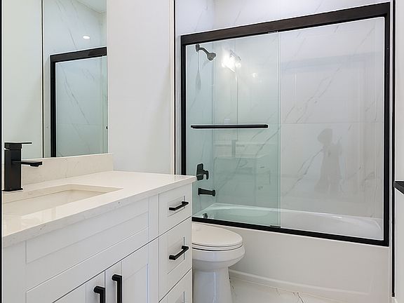 Sleek white tile flooring runs throughout, while the primary suite boasts a standing shower.