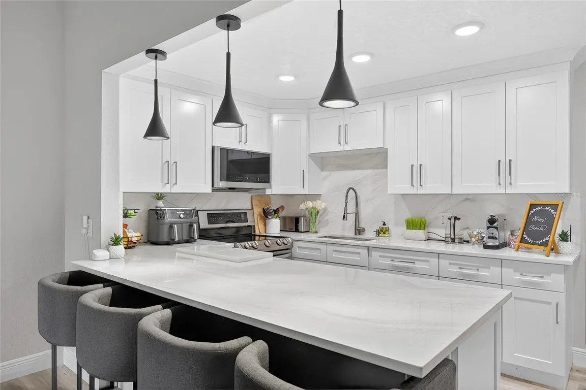 Cambria quartz countertopsNew custom cabinetsElegant lighting fixturesPgt hurricane impact windows