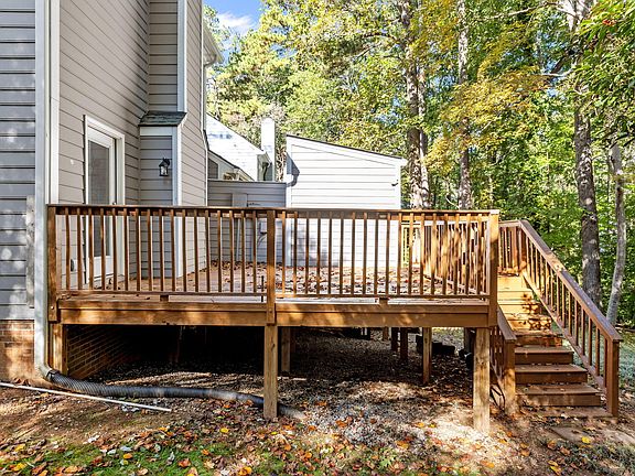 Welcome to this delightful end-unit townhouse, perfectly situated just minutes from Downtown Cary. Nestled on a corner lot, this home offers the ideal blend of privacy, curb appeal, and low-maintenance living. The beautifully landscaped yard features mature trees and a serene setting — perfect for relaxing outdoors or entertaining on the spacious back deck, which includes a ready-to-use gas hook-up for your grill. A convenient storage room provides extra space for your outdoor essentials. Step inside to a freshly updated interior showcasing new paint throughout, brand-new carpet, modern light fixtures, recessed lighting, ceiling fans, and updated hardware. The main living areas feature beautiful hardwood and tile flooring, creating a warm, inviting flow throughout the main level. The cozy den highlights a classic brick gas log fireplace, adding charm and character to the home. Enjoy an eat-in kitchen area ideal for casual meals, plus a formal dining area that can easily serve as an additional sitting or flex space. The kitchen is equipped with a well-maintained stove and dishwasher, along with a brand-new microwave for added convenience. The main level includes a guest half bath, while upstairs you'll find two spacious bedrooms, each with its own en-suite bathroom — offering privacy and comfort for everyone. A versatile third-level bonus room, accessible from one of the bedrooms, provides endless possibilities — perfect for a home office, playroom, studio, or even a guest sleeping area. Located in a desirable, well-kept neighborhood where landscaping is handled by the HOA, this townhome provides easy access to major roads, shopping, restaurants, parks, and all that Cary has to offer. Don't miss this exceptional opportunity to own a move-in-ready home in one of the Triangle's most desirable areas — schedule your showing today!