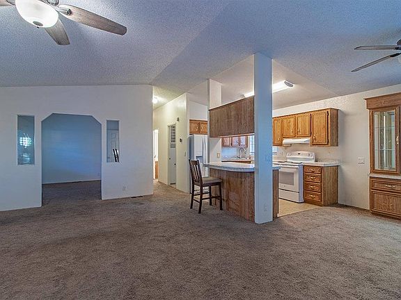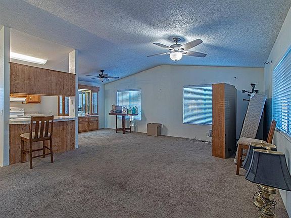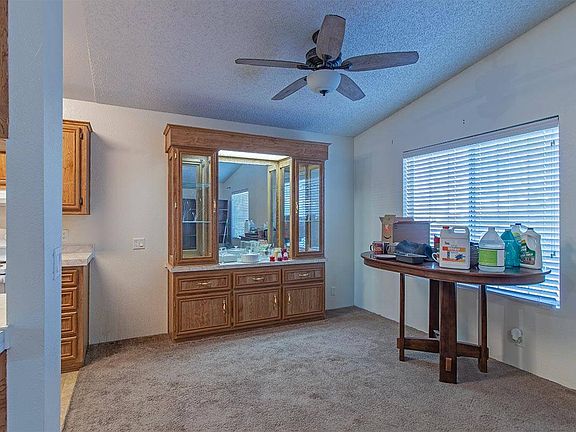 Welcome home to peaceful and comfortable 55+ living in Henderson's most desirable gated manufactured home community. This spacious 1248 sq. ft. 2-bedroom, 2-bath + den home has been beautifully maintained and is move-in ready for its next owner. Located on an elevated lot, the home offers attractive low-maintenance landscaping, a full-length covered patio, and convenient, on-site covered parking with a matching storage shed. The property backs directly to the community recreation area, giving you easy access to tennis, swimming, and relaxing outdoor spaces. Inside, a bright front great room welcomes you with vaulted ceilings, open living spaces, and tape-and-textured drywall throughout. The kitchen, dining room, and living room flow together seamlessly-perfect for relaxed everyday living. A built-in dining hutch provides extra style and storage. All appliances are included, even the washer and dryer located in the laundry room just inside the back door. A versatile den sits off the living area, ideal for a home office, craft room, or reading space. The primary bedroom easily fits a king-size bedroom suite and includes mirrored closet doors and a private bath with a walk-in shower. The guest bedroom and guest bath offer comfortable accommodations for visitors. Ready to move now? This home is available now and is priced to sell quickly.