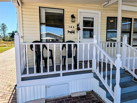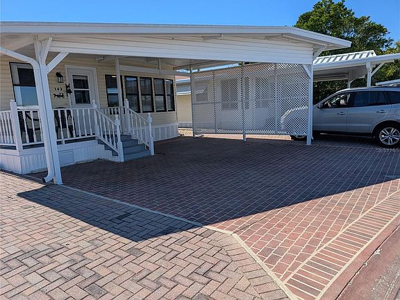 YOU OWN THE LAND AND NO CDD! This charming 2 bedroom, 1 bath home is ready to move into and situated on an outside lot with no rear neighbors. Lot is paved all around, so minimum upkeep. Property has an extra large carport added in 2010. This is a gated community with access by remote or electronic pad by pin number which changes monthly. The streets and sewer are privately owned by the community. The City of Davenport bills for your water and trash. The inviting clubhouse has many events and activities including bingo, cards, dance lessons, arts & crafts, major holiday meals, pot lucks, hot dog and hamburger Wednesday lunches at low price, often with entertainment. Outside bath entrances at the pool, so you do not have to go through the clubhouse. Pool area has it's own gate entrance and a covered area with pool chairs and hot tub. Close to Advent hospital, doctors, Posner shopping center with all major stores and restaurants. Beaches about hour drive and of course Disney & Universal parks, and many other entertainment. The roof was replaced in April 2010 with 2" insulation with aluminium roof. Plumbing updated in July 2025. Water heater was replaced in 1995.