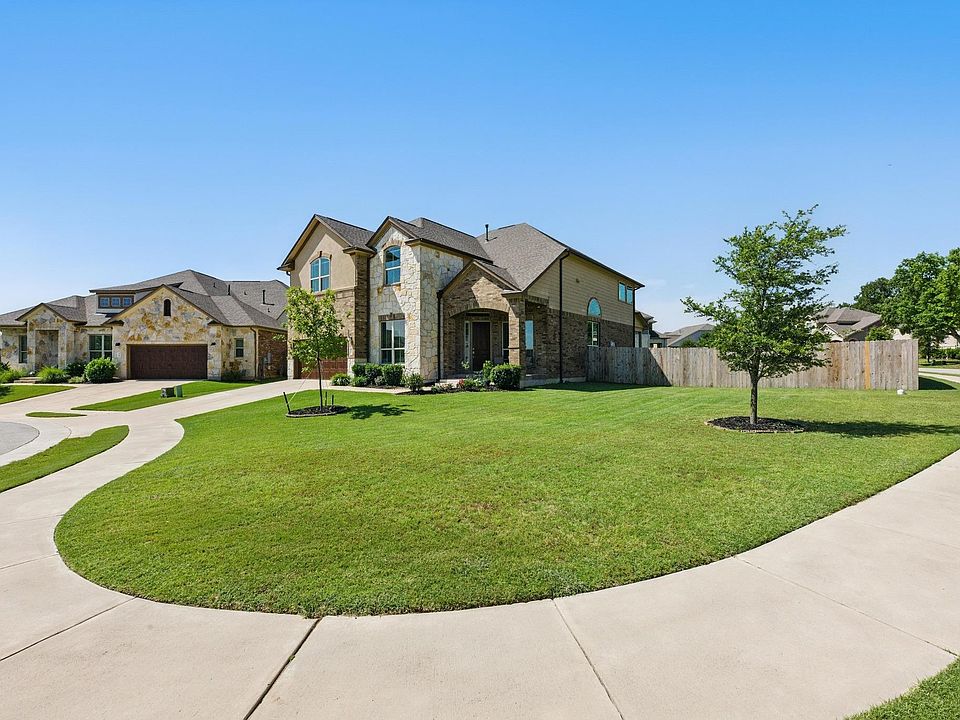 Tucked into the prestigious Arrowhead Ranch community, this 5-bedroom, 4-bathroom, home sits on a roomy 0.28-acre corner lot and offers 3,689 sqft of well-planned space. Whether you're juggling a busy household, sharing space across generations or just want some breathing room, this home delivers the flexibility and flow to match. From the moment you walk in, the wide-plank wood floors and soaring ceilings set the tone—spacious, bright, and welcoming. The main level features an office, two dining areas and an open-concept kitchen and living room that make everyday life and entertaining feel effortless. The kitchen checks all the right boxes with a large center island, sleek cabinets, granite counters and stainless appliances. The living room brings the wow factor with double-height ceilings, a cozy fireplace and perfectly placed windows that provide natural light by day and moonlight by night. Also on the main floor: a generously sized primary suite features a fabulous ensuite and massive walk-in closet. A second bedroom and full bath round out the downstairs. Head upstairs to find three more bedrooms, two full bathrooms, a flexible room and a dedicated media room ready for movie nights. Out back, the covered patio opens to a large yard that’s a blank canvas for whatever outdoor setup you’ve been dreaming about—pool, fire pit, outdoor kitchen or all the above. With no neighbors right on top of you, there’s plenty of privacy and possibilities. Arrowhead Ranch is a laid-back, established community with access to Onion Creek for kayaking and fishing, trails, parks and over 360 acres of green space. The neighborhood amenity center features a pool, playground, outdoor grill, and more. With no MUD, no PID, and a low tax rate, it’s easy living. You’re close to H-E-B, Home Depot and a growing list of local breweries and distilleries. Zoned to top-rated Dripping Springs ISD with quick access to 290, this is Hill Country living at its best.