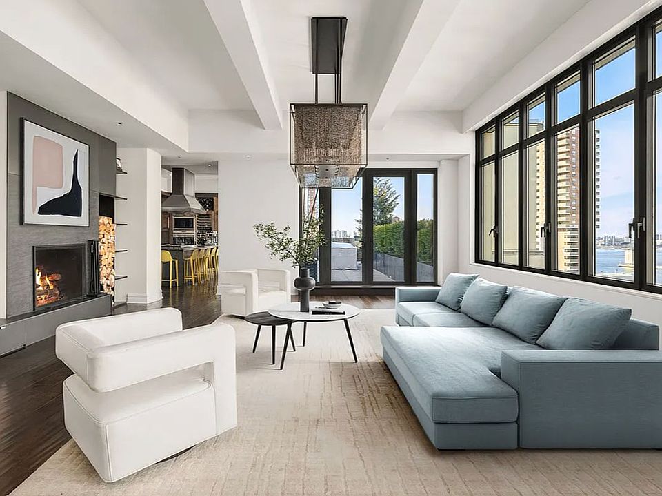 The visual splendor unfolds the moment you enter the refined entry gallery, offering a perfectly framed view of City Hall architectural landmarks and the Brooklyn Bridge. Adjacent to the gallery, a remarkable corner den/media room serves as a versatile space-ideal as a fifth bedroom, staff quarters, or home office-boasting stunning cityscapes to the East and South. Step into the expansive 36-foot-long main living and dining area, which can be seamlessly secured from the den and elevator bank with an electronic vault-style security door. This captivating space is adorned with a wall of oversized windows, flanked by two private terraces. These terraces provide awe-inspiring, bird's-eye views to the North, East, and West, showcasing iconic landmarks such as the Empire State Building, the Hudson River, and 56 Leonard Street.