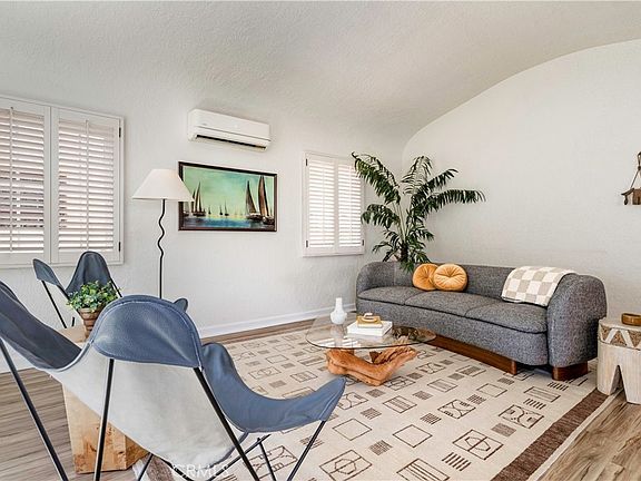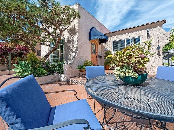 Enjoy the best of Belmont Shore living in this charming Spanish Bungalow, just one block from the boutiques and restaurants of Belmont Shore/2nd St, and two blocks to the beach. Behind the entry gate, a lushly landscaped courtyard welcomes you with generous space for outdoor dining and lounging. Step inside the house and classic details like coved ceilings and arched passageways highlight the home’s classic Spanish design, while modern upgrades such as zoned heating and cooling ensure everyday comfort. The 1,332 square foot interior offers a thoughtful layout; living room, dining room, kitchen, and family room are distinct yet flow effortlessly with continuous luxury vinyl plank flooring. The bright, expansive kitchen features abundant cabinetry, a wine fridge, countertop seating for four, and a seamless connection to the cozy family room with its brick fireplace. Two bedrooms provide flexibility, with one customized as a home office with built-in desk, shelving, Murphy-style bed, and dual closets, and the primary bedroom featuring a spacious mirrored wardrobe. The updated bathroom features dual sinks and a spacious shower accented with glass tile accent. Accessible from the family room, the back yard includes a covered lounge with ceiling fan, an open patio area with a built-in gas grill, and an electronic rolling gate for optional off-street parking. Adjacent to the patio at the back of the property, a separate bonus structure houses laundry, built-in storage, and work benches; ideal as a workshop, studio, or home gym. This is Belmont Shore at its best, with classic charm, modern updates, and indoor-outdoor living just steps from the beach and the shops and restaurants of 2nd St.