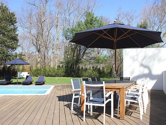 This beautifully renovated and furnished house is extremely private, set far off of the road, amidst an acre of trees, sun and a huge deck area with oversized heated pool, hot tub and bocce court. There is a full bathroom for every bedroom and biking distance to a gorgeous bay beach and less than 2 miles to town. You can fit the whole family (plus many others!) -- newly renovated and 4 car garage. Ideally looking to rent for at least 2 weeks to one month. Renter pays monthly bills. No broker fee (unless you are a broker- brokers welcome).