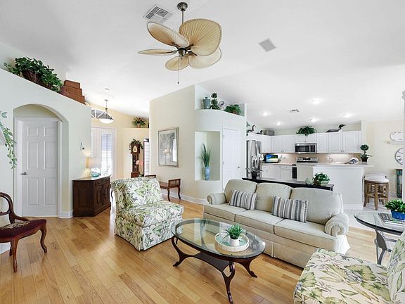 This 2001 built inland home on the Isles of Capri will delight with its 3 Bedroom, 2 Bath layout, screened in swimming pool, and two car garage. Featuring a walk-in shower and a jetted tub in the primary suite along with a separate water closet allowing for maximum privacy. The second and third bedrooms allow for family, friends, or work-from-home office space. With a fireplace in the living room, and built-in cabinets you'll enjoy cozy living island style. The kitchen, with bar, allows for easy meal prep or entertaining all while overlooking your private heated pool. Hang out on your lanai poolside and enjoy the island breezes while having cocktails in your own private oasis. With a nearly 12' slider that opens completely your into and outdoor space become one. The pool sits at the living level so it's an seamless step out of your family room into your outdoor space. Sitting above the current floodplain, this home has never had any type of storm surge. The Isles of Capri is one of Naples' last hidden gems. With approximately 1800 full and part-time residents, Capri has a unique home-town feel. Nestled between Naples and Marco Island, the Isles of Capri features four restaurants, a church, a fire station with EMS, and a two mile walking path.