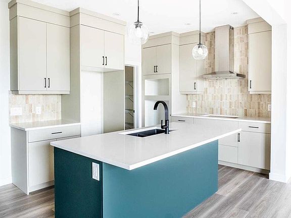 Prairie exterior elevationChef-inspired kitchenFlat panel cabinetsAccent islandChimney range hoodBuilt-in gas cooktopSpacious walkthrough pantry