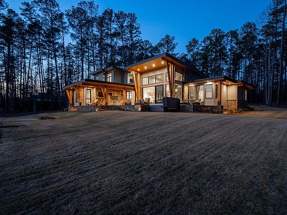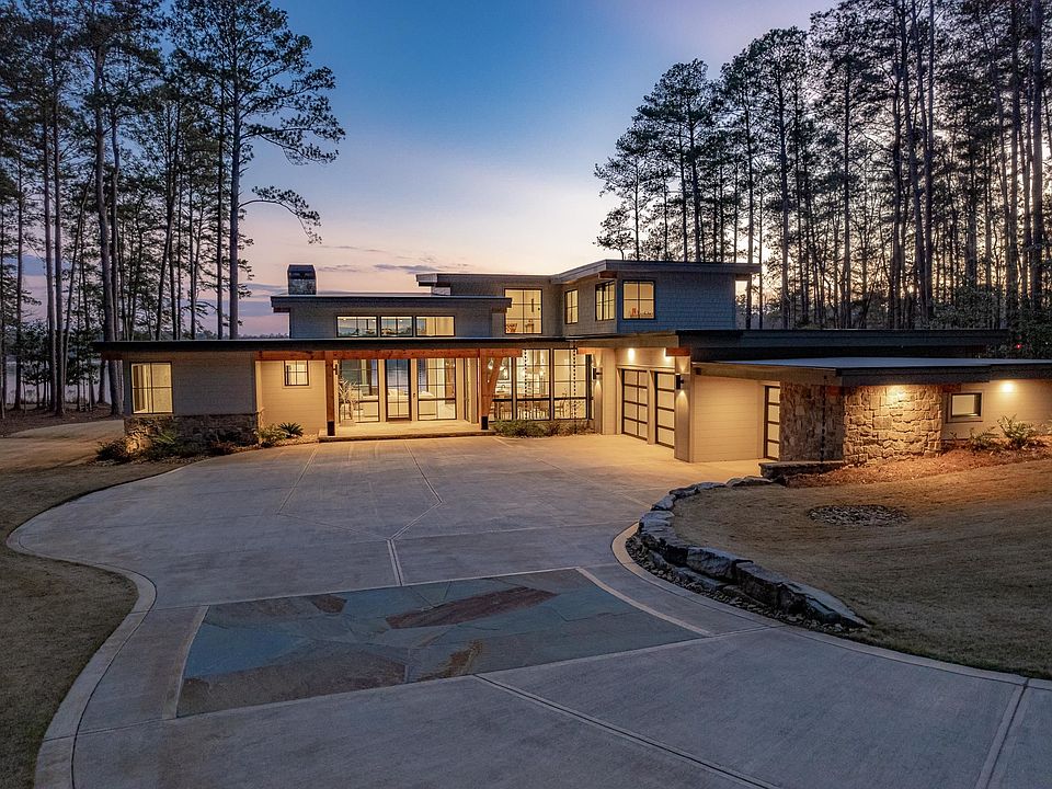 Unique and Stunning offering on Lake Sinclair on Nancy Branch Cove. This custom home was painstakingly built in 2021 and no detail was too small for precise consideration. The design and floorplan of this Mid Century Modern home leaves you in awe the moment you walk up to and through the front door. The sellers lovingly christened this homeplace "The Olive Tree" and it is memorialized by a olive tree in the front garden. This home boasts 2 master bedroom ensuites on the main level. The kitchen has beautiful custom cabinets and a fabulous custom curved vent hood. The long open island and bar overlooks the heart of the home and anchors the family room and dining room around the kitchen. Ideal set up for entertaining friends and family. The second level features two bedrooms and full bath plus a flex room for today's modern family. The division between inside and outside is only separated by the glass windows and doors. Step outside on the lakefront porch to host a party or cookout with the awesome outdoor kitchen which includes a Memphis Grill and EVO Blackstone, two gas top burner cooktop. industrial vent hood, mini fridge and fireplace. You can watch TV or soak in the hot tub while you are preparing meals. There is over 350 feet of water frontage with a max dock and boathouse. The 4+ acre lot consists of several parcels that include fee simple and access strip Ga Power lots. The features and design elements of this home are just too many to list, but a few are white pine beams, cypress v groove wood, real stone, quartz, custom cabinetry, TPO 3 gauge roofing and top of the line Sierra Pacific windows and doors. The interior is open light and bright and includes neutral colors and complimentary elements of design.