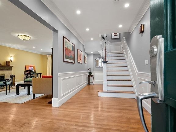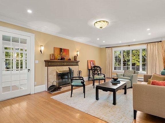 This elegant stucco single-family residence offers the best of both worlds: the timeless appeal of 1920’s architecture updated for today's modern lifestyle. This home features four generously proportioned bedrooms (three are en suite), four full bathrooms, and one half bathroom. Convenience, comfort, and stylish design are thoughtfully considered throughout. The living area encompasses 3045 square feet, providing a substantial canvas for creating distinct living spaces. A finished lower level with bedroom/living room, full bathroom, and private entrance is perfect for a live-in nanny or as an in-law suite or office/fitness room. The upper level brings the wow factor! Spanning the length of the house, it boasts a cathedral ceiling, bookshelf-lined wall, and lovely views of the surrounding tall trees. Situated on a landscaped corner lot of 8650 square feet, this home has mature plantings and tall hedges for privacy. Two attached garages and a side-street driveway with multiple parking.