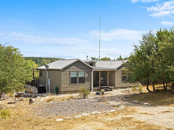 Experience serene Hill Country living at this charming cottage retreat set on 5.86 acres in the desirable Hill Country Ranches subdivision. Built in 2015, this thoughtfully designed 2-bedroom, 2-bath home combines rustic charm with modern comfort, offering open-concept living spaces, natural light, and beautiful Hill Country views. The living area features vaulted ceilings, a cozy potbelly fireplace and french doors that open to the huge back deck. The well-appointed kitchen makes use of the quaint space with built-in appliances, ample cabinetry and plenty of counter space. The primary suite includes a full bath with a beautiful claw foot tub and direct access to the back deck, creating a peaceful space to unwind. The pinnacle of this property is the future build site that has the most breathtaking Hill Country Views as far as the eye can see. Build the home of your dreams or a compound of cabins!! The property also features 2 separate studios that can be used in so many ways -a home office, creative workspace, gym or even a separate bedroom. The outdoor bbq area is perfect for enjoying Texas evenings with some yard games or relaxing. The large covered back patio has a TV and a dart board, so bring on football season! Enjoy the tranquility of the outdoors from multiple covered porches, surrounded by mature oaks and native landscaping. Additional highlights include a private well, septic system, propane, tankless water heater, 2 storage units (one climate controlled) and above-ground utilities. With Blanco ISD schools and low annual HOA dues, this property offers both convenience and privacy just minutes from Wimberley, Blanco, and Dripping Springs. Perfect as full-time residence, weekend escape, or investment opportunity. This Hill Country gem captures the essence of Texas living. **Most furnishings can convey!**