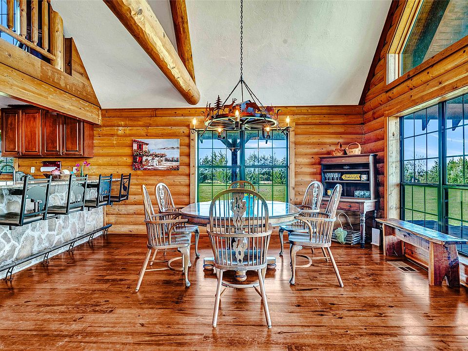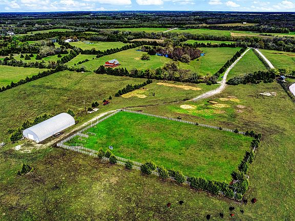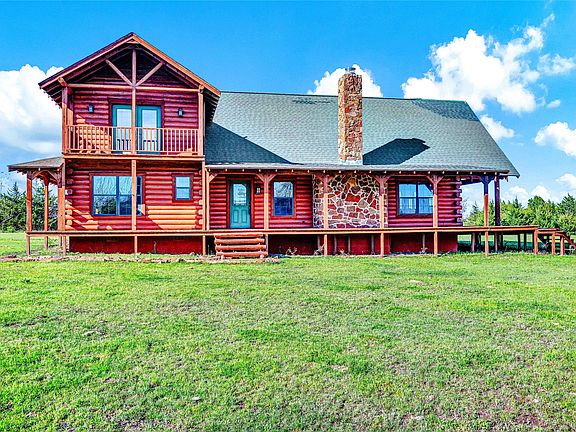 Bring your horses, goats and livestock to this fully fenced, Ag exempt, 37.6 acre property with over an acre of pond fed by nearby creek and zero floodplain! Acreage is 100% useable land including pasture along with heavily treed areas. Brand new $15K entrance road in 2025! A short walk from the cabin leads to a 3700 square foot metal barn, which can be used for equipment storage, and also has an area specifically for animals. The barn comes equipped with two garage bays and a built-in tack room with electricity and a water line. Pipe fence riding arena, located directly next to the barn, for horse training, riding, and roping. Concrete RV pad for parking. Sip your morning coffee on the covered, wrap-around porch as you soak in the serene views. The front entry opens to a spacious open floor plan with rustic luxury at its best, featuring cathedral ceilings, real wood walls, doors and beams, real hardwood floors, and light fixtures with lavish country design. A large stone wall in the living room houses a wood burning fireplace with gas starter and a raised hearth. The eat-in kitchen includes an undermount hammered copper farmhouse sink, redwood cabinets, leaded glass cabinet with hanging stemware rack, pot and pan drawers, and granite countertops. Off the kitchen is a spacious dining room, centered with a wagon wheel chandelier, and showcases soaring windows with views of the pond and pasture. Glass French doors lead from the dining room to the back deck. The first floor primary bedroom offers ample space for a sitting area, windows that overlook the property, and an en suite bathroom. A wooden log staircase leads to the upstairs loft or family room, perfect to watch movies, play games, or could serve as an office or a play area. The second floor primary bedroom features a balcony deck and a luxurious en suite bathroom. Perfect for vacationing and getting away from the hustle and bustle of city life, yet the property is only a quick 45 minute drive to McKinney.