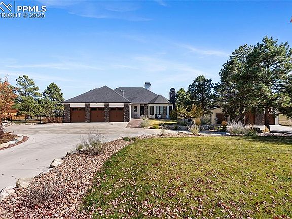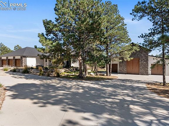 This beautiful ranch-style home sits on 2.8 acres in a peaceful cul-de-sac in the Bent Tree neighborhood. With picture-perfect curb appeal, lush landscaping, & oversized driveway, this home impresses from the moment you arrive. Inside, you’re welcomed by an open & airy layout with vaulted ceilings, bright hardwood & laminate flooring, & walls of windows that fill the home with natural light. The main level offers 2 inviting living rooms, each with a cozy fireplace. The remodeled kitchen is a showpiece with endless white cabinetry, granite countertops, stainless steel appliances, & oversized island that anchors the space & flows to the dining area. The main living room opens to a brand-new covered deck with outdoor fireplace that showcases beautiful views & gives plenty of space—ideal for entertaining or relaxing under the stars. The primary suite is a true retreat with vaulted ceilings, private deck access, & ensuite with dual vanities, tub, shower, & large closet. A junior suite with ¾ bath, 2 additional bedrooms & full bath provide a perfect setup for family & guests. The main level includes a laundry room & mudroom. The lower level feels like its own home, featuring built-in shelving that opens to a secret room, spacious family & game area divided by a double-sided fireplace, & wet bar with a dining area that opens through a large accordion glass door to the covered patio & outdoor fireplace. You’ll also find a media room, 2 guest bedrooms, full bath, gym, & office/craft room. Surrounded by mature trees & thoughtful landscaping, the backyard offers turf, plenty of seating, and space to play. 40X50 heated & cooled finished workshop with RV bay & ½ bath give you a comfortable space to work. One bay is reinforced & ready for a lift or heavy equipment. With 10 garage spaces between the attached and detached garages, there’s ample room for vehicles, RVs, & toys. Conveniently close to Monument yet offering complete privacy & tranquility, this home truly has it all.