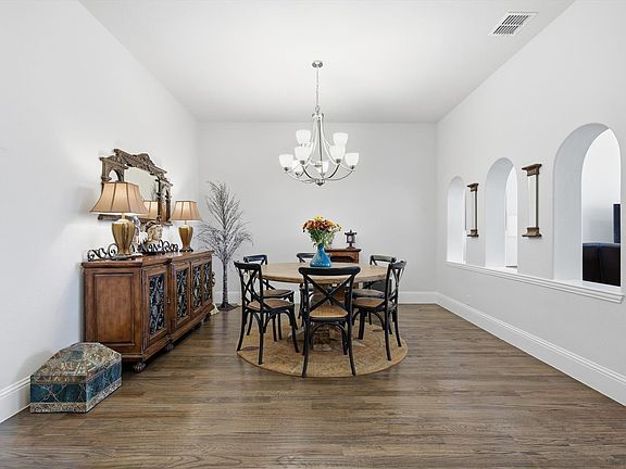 Hard-to-find single story in a quiet, established pocket of Prosper. This home brings together architectural presence with an easy, intuitive layout—designed for the way people truly live. Set on a generous .34-acre lot ready for the pool, it checks every box: oversized dining room, open concept living, smartly separated bedroom wings, and an office tucked behind French doors for those who work from home or want a dedicated space. Just under 2800 square feet, the design offers high ceilings, thoughtful transitions, and sightlines that keep everything feeling open without losing definition. The living area features dramatic cathedral ceilings and a stone fireplace as its focal point. Handscraped hardwood floors run throughout the main areas, lending texture and warmth. The kitchen centers the home with a gas cooktop, walk-in pantry, and a large island built to handle everything from prepping dinner to hosting friends. There’s also a casual breakfast area for quieter meals. The primary suite offers a calm retreat with tray ceilings, natural light, and a spa-like bath designed for function and comfort. Two additional bedrooms sit apart from the main living areas, connected by a private hall—perfect for kids, guests, or multigenerational living. Out back, the extended covered patio is already in place. The lot is pool-ready with plenty of room left for green space or a garden. A true 3-car garage offers space for vehicles, storage, or workshop flexibility. Walking trails surround the neighborhood, making it easy to step outside and enjoy nature without leaving your community. Located in Prosper ISD with quick access to the Tollway and close to major shopping, dining, and conveniences. No stairs, no wasted space—just a home that lives with clarity, comfort, and quiet confidence.