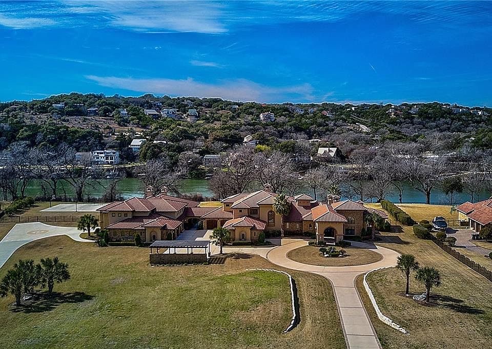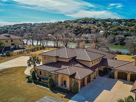 Gorgeous estate, situated with 400feet of lake frontage in the esteemed, gated Bellagio Estates of Steiner Rancher. Designed with entertainment in mind, the main house is complete with 5 bedrooms, one of which is a separate guest quarters with private entry. Wine room, bar overlooking formal living and dining, media room and 2 story study all with a 7 car garage. Second space is connected to main house by a porte-cochère and is the entertainment zone, complete with another full theater room, billiards room, game room, work room with viewing window overlooking back yard and climate controlled garage for full size bus or 9 additional cars... it is also an indoor basketball court! But wait, the entertainment does not stop there. You enter the backyard to find the pool overlooking Lake Austin with a full-size sport court and volleyball court, all with a path down to the oversized 2 slip boat dock with lifts & Touchless covers.