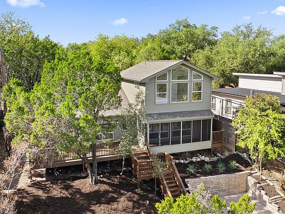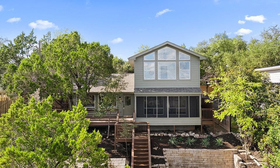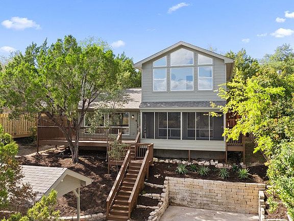 Experience breathtaking Hill Country views from this beautifully updated two-story home. This 3 bedroom, 2 bathroom home offers an inviting layout designed for comfort, style, and effortless entertaining. The main level features a spacious open flow, ideal for gatherings and everyday living. Fresh paint throughout and modern updates create a bright, welcoming atmosphere. Both full bathrooms have been completely remodeled with contemporary finishes, and major improvements—including a new roof and new HVAC—provide peace of mind for years to come. Upstairs, the expansive primary suite features vaulted ceilings and floor-to-ceiling windows frame sweeping panoramic Hill Country views. Outdoor living shines as well, with a huge front porch and a charming screened-in porch, perfect for enjoying serene evenings and quiet mornings. Located in a community rich with amenities, residents enjoy lake privileges, jogging trails, a playground, and a refreshing community pool—offering the full lake lifestyle. Move-in ready, fully updated, and surrounded by natural beauty, this home is the perfect blend of comfort and Texas Hill Country charm.