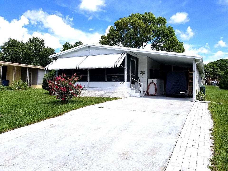 Close to front of this gated community. Lots of upgrades. Nice circular kitchen, Laminate and tile floors throughout. Enclosed porches one in front and one on the side. Large workshop with double doors and a covered patio in back. Yard has fenced area. Newer Roof over and AC. Furnished and the extra fridge stays.