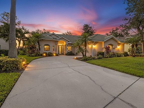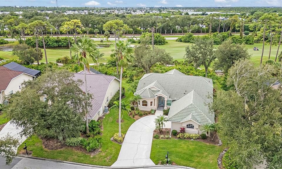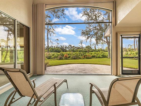 Located in the beautiful gated community of Riverwood, this charming 2-bedroom, 2-bath home with a den or office is perfectly positioned at the end of a quiet cul-de-sac on the 9th hole, offering both privacy and lovely golf course views. Just a short stroll from the community center, you’ll have easy access to the many amenities that make this neighborhood so special. With an open and split floor plan, this home blends comfort and functionality while creating a bright and welcoming atmosphere from the moment you step inside. The main living area greets you with soaring ceilings, soft natural light, and an easy flow that makes the home feel both spacious and warm. The living room features sliders to the lanai topped with transom windows, creating a light-filled and airy setting. The family room flows into the kitchen, creating an inviting gathering space. Expansive picture windows line the back wall, framing peaceful views of the golf course and garden. The kitchen features solid maple wood cabinets, stainless steel appliances, a breakfast bar, and a cozy breakfast nook accented by an aquarium window that overlooks the lush landscaping. Off the living area is a laundry room with built-in storage. The lanai is generously sized and features a clear view screen, allowing you to enjoy the scenery without visual barriers. Just beyond, a spacious brick paver patio extends the living space outdoors, creating a perfect place to relax, grill, or gather with friends. There is also room to add a pool if desired. A separate office or den at the front of the home offers flexibility and charm with its lovely bay window, making it an ideal space for working or reading. The primary suite is tucked away for privacy and comfort, featuring sliders to the lanai, a walk in closet, dual sinks, a spa tub, and a tiled walk in shower. The guest bedroom and bath can be closed off with a pocket door to create a private suite for visitors. Additional features include a newer roof installed in 2017, impact resistant windows, an impact resistant garage door 2024, and an HVAC system and hot water heater that were both replaced in 2021. The hot water heater also comes with a 12-year transferable warranty for added peace of mind. The lanai was rescreened in 2022, making this home move-in ready with valuable updates already in place. As part of the vibrant Riverwood community, residents enjoy a par-72 championship golf course, a state-of-the-art fitness center, a resort-style pool, pickleball courts, and Har-Tru tennis courts. Beyond the gates, you will find easy access to world-class fishing, boating, waterfront dining, shopping, and the beautiful sandy beaches of the Gulf. Conveniently located between Sarasota and Fort Myers on Florida’s West Coast, this home offers a wonderful blend of comfort, convenience, and resort-style living. Schedule your private showing today!