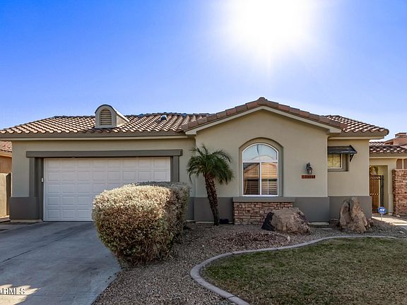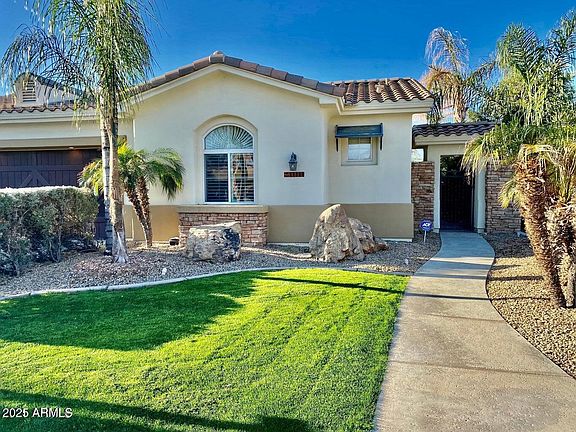 Welcome to this stunning home in the desirable Palm Valley Phase 2 community. This thoughtfully designed home offers a gated courtyard entry, natural travertine flooring throughout main living areas, cozy stack-stone gas fireplace in the family room, double ovens, water softener, RO system, freshly painted interior/ exterior, air conditioned garage, epoxy garage floors, and owned solar panels. The outdoor living reaches new heights with a refreshing pool, relaxing spa, and a built-in grill perfect for year-round entertaining. The neighborhood provides excellent amenities including a community center and pool, while golf courses, shopping and dining options are just minutes away.