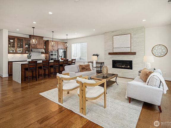 This 5-bedroom home rises above the rest with stunning mountain views and exceptional craftsmanship. Impeccably maintained & upgraded throughout, it offers true move-in perfection. Highlights include hardwoods throughout, a tiled spa-inspired ensuite, designer finishes, A/C, EV charger, & whole-house Generac generator for peace of mind. The versatile lower level is ideal for multi-generational living or guest quarters. Outdoor living shines w/ a covered patio, terraced & private backyard, w/ river & trail access just moments away. Come see what North Bend has to offer — Award-winning schools to endless outdoor adventures. A rare opportunity to enjoy elevated living with comfort, style, & convenience all in one.
