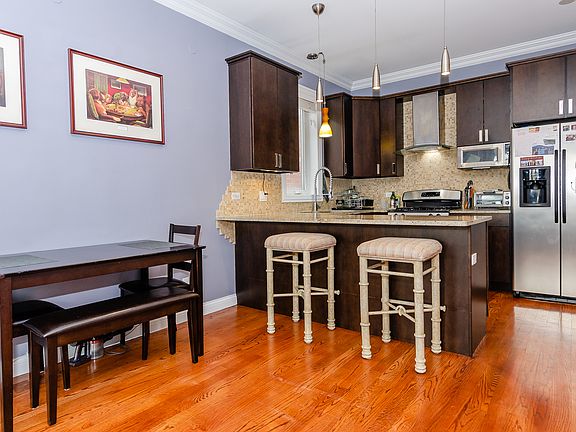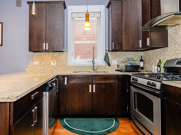 Well maintained luxury two bedroom/two bath unit with stunning finishes. Unit shows like model with crown molding and walnut hardwood floors throughout. The sunny living room features a juliet balcony, gas fireplace, surround sound, and a custom built in desk to make working from home a delight. Modern chef's kitchen with granite and stainless appliances, breakfast bar that can accommodate up to four stools, and a pantry. Central heat/ac controlled with Nest thermostat. Luxury master bedroom with custom organized walk in closet and en-suite bathroom with double vanity sink, large jacuzzi tub and separate shower with body sprays. Relax on your covered rear deck that can be accessed through either the master bedroom or unit back door. One garage parking spot and large private storage room included. Building also has a shared backyard patio for even more outdoor space to enjoy!