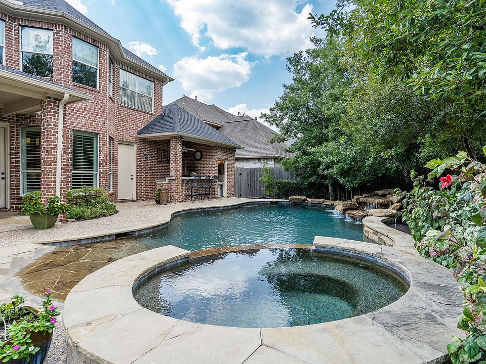 Updated custom home with sparkling pool on a cul-de-sac street in Champion Forest. All brick home offers a whole home generator, 2 car garage with 240 plug for an electric car and 2 car covered additional parking. Double doors open to the soaring entry with real wood floors found also in the study, dining and den. Kitchen remodeled in 2018 is open to the dining and breakfast with pool views and wood shutters which can be found throughout. Light and bright kitchen- Thermador 6 burner gas cooktop, double ovens, lighted cabinet tops, island, under cabinet lighting, pot filler and travertine floors. Primary bedroom has a fireplace, sitting area, remodeled bath with a free standing tub, granite dual sink vanity, frameless shower and travertine floors. Generous gameroom up along with 3 beds and 2 remodeled baths. The sparkling pool has a beach entry, Pebble Tech siding, water features and spa. Large covered patio, additional summer kitchen with gas grill and sink plus a convenient pool bath.