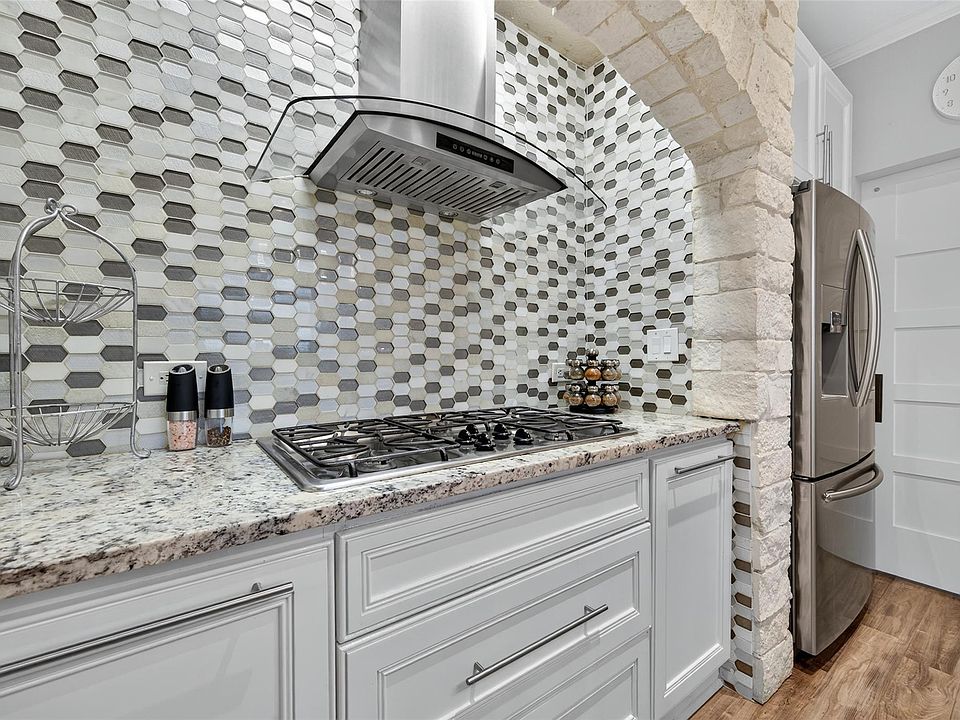 Brick fireplaceSleek accent fireplaceElegant finishesPrivate backyard oasisBuilt-in grillWarm wood-look flooringAbundant natural light