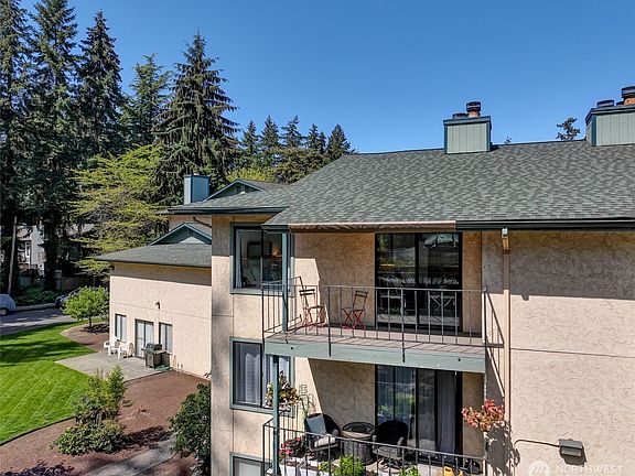With amazingly high vaulted ceiling, modern touches, & updates, this home welcomes you! This beautiful top floor, end-unit is move-in ready. Spacious living room with wood fireplace & deck. Wonderful kitchen with stainless appliances that opens to ample dining space. Enjoy two generously sized bedrooms and a modern bathroom. Includes in-unit washer & dryer, 2 storage spaces, 1 covered parking space located directly in front of unit, & plentiful guest parking! Quiet & well appointed community. Pets welcome w/few restrictions. Walk to shops, library, & restaurants. Easy commute to Microsoft, Google, & community. Just minutes from I-405 and Totem Lake shopping. Lake Washington schools.
