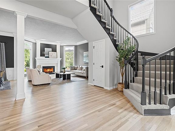 Welcome to this stylish, move-in ready 2-story home nestled in the heart of Overland Park. This generous residence offers 4 bedrooms, 3 full baths, and 2 half baths, ensuring plenty of space for comfortable living. As you enter, a vaulted entryway with a striking curved staircase captures your attention, enhanced by newly refinished hardwood floors. The freshly painted walls and trim, paired with elegant plantation shutters, create a pristine, inviting atmosphere. This home boasts an open floor plan designed for modern living and entertaining. Expansive living and dining areas welcome you with an abundance of natural light. The main level includes a dedicated home office along with a half bath. At the heart of the home, the eat-in kitchen stands as a true centerpiece, featuring a large island with ample bar seating. Adjacent to the kitchen, a cozy hearth room with a fireplace provides a warm and inviting retreat, perfect for relaxation. The spacious primary suite offers a beautifully updated bath, complete with heated floors, including the shower, for a spa-like retreat. It also features a custom closet and a cozy fireplace. Upstairs, you will find three additional large bedrooms, one with its own private bath and the other two sharing a convenient Jack and Jill bath. The second-floor laundry room adds to the home's functionality and convenience. The finished walk-out basement includes a large recreation room with a wet bar and a custom cherry wood bar top with 2 beverage refrigerators. A 5th non-conforming bedroom or office, plus ample unfinished storage, makes the lower level versatile and functional. The screened-in porch is an outdoor living haven complete with a heater and a ceiling fan. The beautifully landscaped, fully fenced backyard features a large patio for a second outdoor living area. Don't miss your opportunity to own this exquisite home in a sought-after location.
